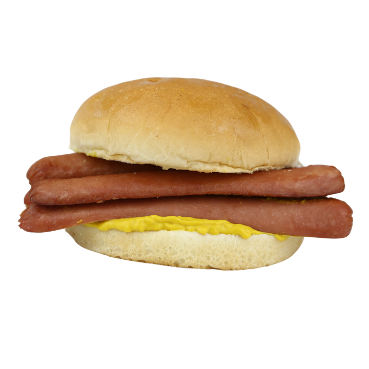 2 all beef hot dogs, split open and grilled flat then placed on a toasted hamburger bun with mustard for a unique sandwich! Add whatever toppings you'd like!