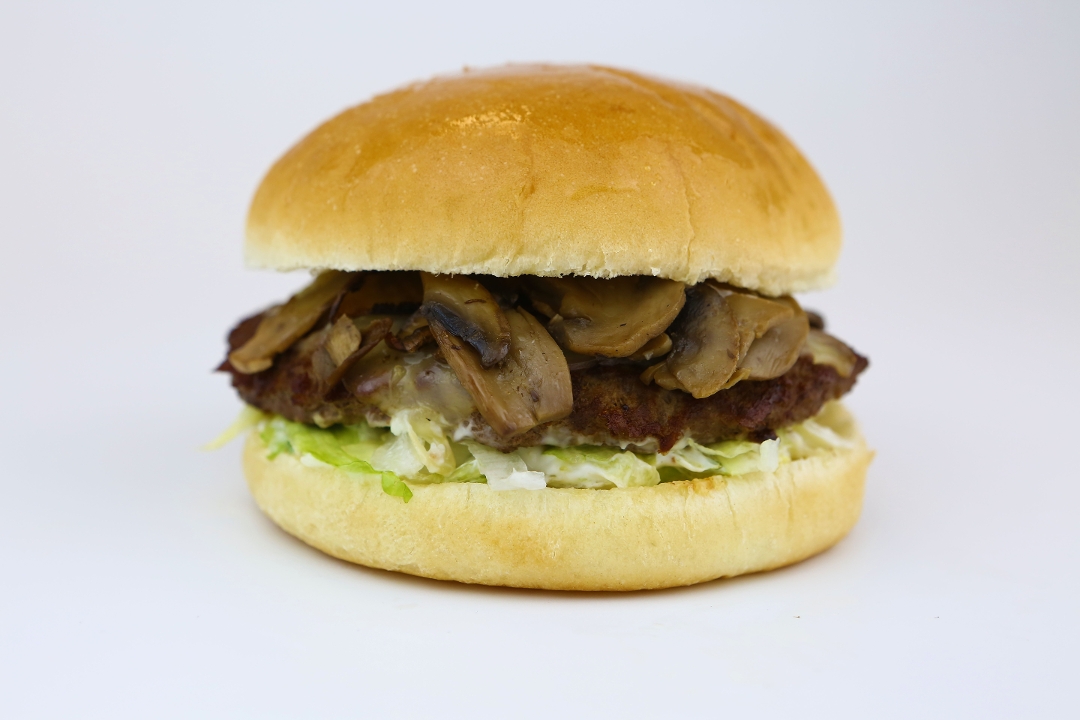 A quarter pound grass-fed beef patty topped with aged Swiss Cheese and fresh grilled mushrooms on a toasted bun with mayo and lettuce.